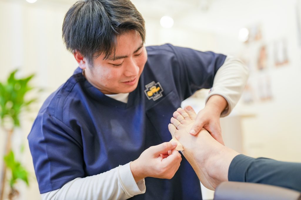 まずは、つらい痛みを少しでも早く楽にしていただくことを大切にしています。「どんな時に痛むか」「いつから痛みがあるか」など、お話をうかがいながら、原因を一緒に探っていきます。専用の足型測定器(フットプリンター)を使って、外反母趾の角度やアーチの状態、重心のバランスを詳しくチェックし、お一人おひとりに合わせた“整足テーピング”を施術いたします。