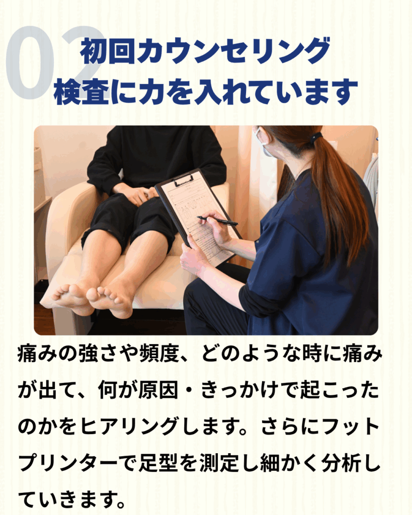 「どこに行っても良くならなかった…」という方もぜひ一度ご相談ください!初めての方も安心していただけるようにカウンセリングもしっかり行っております。あなたの足元から健康をサポートします!