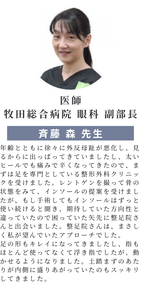 年齢とともに徐々に外反母趾が悪化し、見るからに出っぱってきていましたし、太いヒールでも痛みで辛くなってきたので、まずは足を専門としている整形外科クリニックを受けました。レントゲンを撮って骨の状態をみて、インソールの提案を受けましたが、もし手術してもインソールはずっと使い続けると聞き、期待していた方向性と違っていたので困っていた矢先に整足院さんと出会いました。