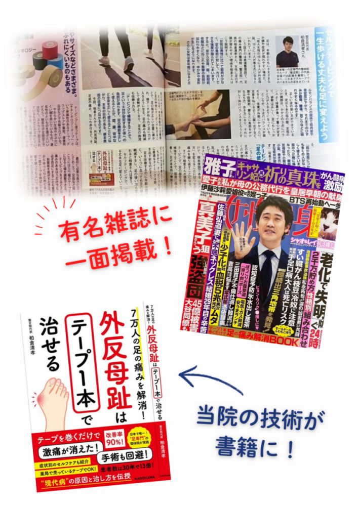 女性の足の悩みに特化した当院の施術が、有名雑誌「女性自身」の一面で特集されました。「ヒールで痛む」「外反母趾が気になる」「長年の巻き爪の悩み」等々ぜひ当院へお任せください!